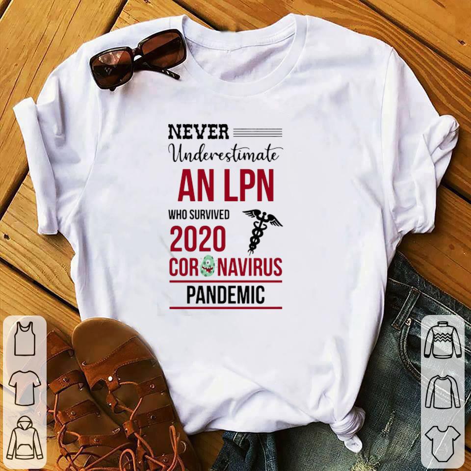 Official Never Underestimate An LPN Who Survived 2020 Coronavirus Covid-19 shirt is an awesome shirt about topic Trending: Coronavirus that our team designed for you. LIMITED EDITION with many styles as a hoodie, long-sleeve tee, v-neck, tank-top, sweater, youth tee, sweat shirt. This shirt has different color and size, click button bellow to grab it.